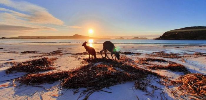 Today we continue across the mighty Nullarbor, taking in Australia's longest straight road, 90 Mile Straight. Visit the outback town of Balladonia, which shot to worldwide fame in 1979 when the Skylab space station returned to Earth here rather abruptly. Watch the ever-changing landscapes from your window as your guide regales the history and stories that make this land unique. By afternoon, turquoise water will replace red dirt as we head towards Esperance. Connect to Country during a 90-minute Dabungool Cultural Experience. Join local Wudjari Nyungar mother and daughter as they guide you on a coastal walk to learn about the six seasons, bushfood and medicine plants that have sustained the Wudjari people for many thousands of years. Then head for the pristine bushland and beaches of Cape Le Grand National Park, our base, for two nights. Today travel around 600km. Accommodation Swag camping at Lucky Bay which has shower and toilet facilities.