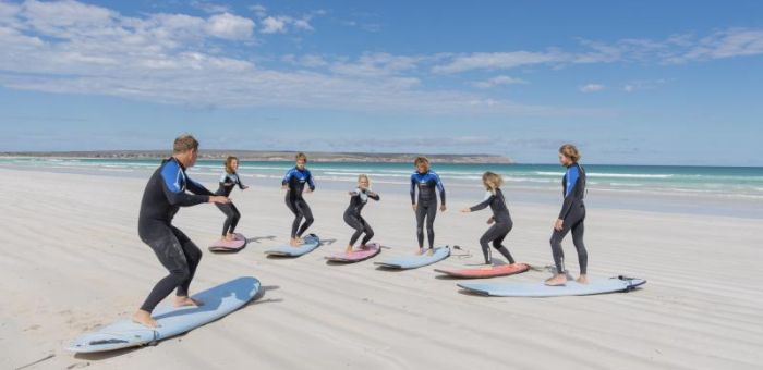 This morning, it's time for one of the tour highlights, swimming with wild sea lions and majestic dolphins on a three-hour cruise in the sheltered waters of Baird Bay. This optional experience is an outsourced adventure operated by Baird Bay Eco Tours and an experience to treasure forever. Following a picnic lunch, peel on a wetsuit for a two-hour learn-to-surf lesson on a pristine beach with Streaky Bay Surf School. Those not wanting to surf will be able to relax, swim or wander the shores. After a big day, arrive in Penong, an outback town famous for its dozens of windmills. Today travel approximately 340km. Accommodation Swag camping at Penong Caravan Park, which has shower and bathroom facilities.