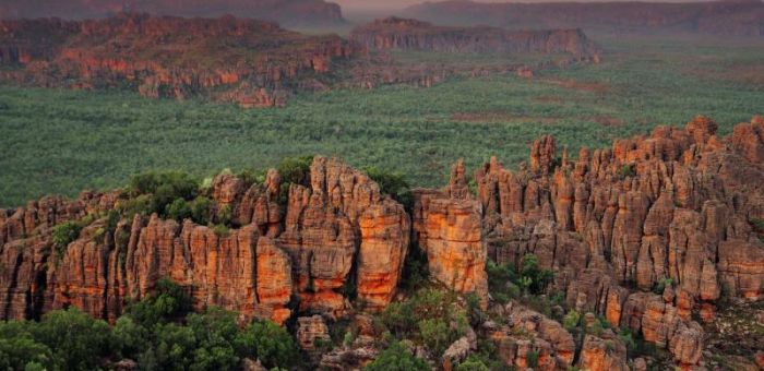 We depart from Darwin and head towards the wetlands region known as WakWak, an hour outside of Darwin, where the top end's magnificent scenery is on display. We have the chance to spot a vast range of Top End birdlife and apex predators such as crocodiles. Our journey continues as we wind our way into Kakadu National Park, where we check into our local accommodation and continue to take in the sights and sounds of nature, 300 kms east of Darwin. We take some time to soak in the landscape and wildlife of the park at the Bowali Visitor Centre before heading to the East Alligator region, the most north-eastern point of Kakadu, for a cultural tour of a lifetime. The group will join the Guluyambi Cultural Cruise down the East Alligator River on the border of Kakadu and Arnhem Land to experience the creation stories of the area, observe majestic birdlife, and, of course, hope to see crocodiles. In this same area we'll visit Ubirr Rock, home to one of the best-preserved collections of Aboriginal Rock Art in the world, and climb up high for a sunset that will take your breath away. We head back to our accommodation for dinner. Meals: Lunch, Dinner. Accom: Mercure Kakadu Crocodile Hotel, options include twin, double, single rooms with ensuite bathroom. Driving Distance: 420km. Hike Distance and Grading: 1km loop Grade 2-3.