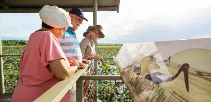 Today is a day of perusing the art galleries and cultural centres that portray the stories of former and present clan groups of the north and south of Kakadu, as well as into Arnhem Land. We will journey on a guided walk through the Burrungkuy (Nourlangie) art site areas, enjoying any combination of places including Kunwarddewardde Lookout, Anbangbang Billabong, Nawurlandja, and should the group feel like an extra bit of walking there is also potential for Naguluwurr art site. Offering unmatched vistas of escarpments, sweeping stone country, savannah woodlands, lowlands and endless floodplains and wetlands, take your time to enjoy the different creation stories and artworks in the various galleries, hear stories about local groups and traditions as well as commentary on the plant and wildlife you see before you. After an amazing sunset on day two of your adventure, we head back to our accommodation for our evening meal and restful sleep. Meals: Breakfast, Lunch, Dinner. Accom: Mercure Kakadu Crocodile Hotel, options include twin, double, single rooms with ensuite bathroom. Driving Distance: 150km. Hike Distance and Grading: 1km grade 2.