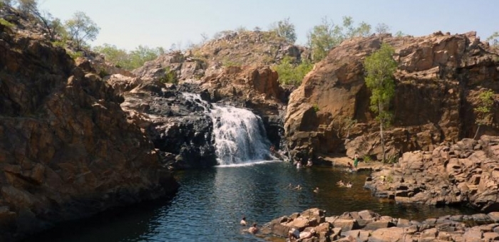 After breakfast, head to either Gunlom Falls or Maguk (Barramundi Gorge) for a swim in another pristine waterhole. Maguk flows down the steep walls of rugged gorges into a beautiful natural plunge pool, while the steep climb to the Gunlom Falls plunge pool is rewarded with sweeping views of Kakadu along with the larger pool which is found under the welcome shade of gum trees. Neither option will disappoint you. After a relaxing morning, it’s time to hit the road. Stop in the old gold-mining town of Pine Creek for lunch before continuing for another three hours to your private campsite on the doorstep of Nitmiluk National Park. Once comfortable, have dinner with the group before settling in under the stars for the night.