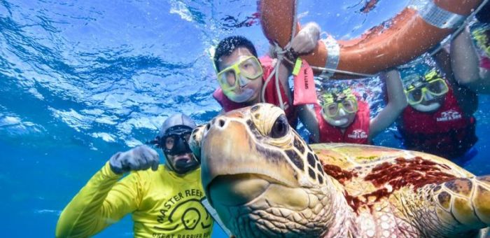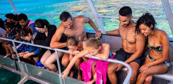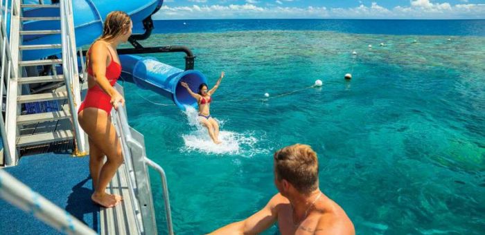 Upon arrival at the pontoon, passengers will be impressed with the various options to enjoy the reef. Snorkelling equipment is included, along with buoyancy vests and lycra suits, and our friendly crew are always happy to help out to get you kitted out in the right gear. Glass bottom boat and semi submersible tours run on a near constant schedule, the underwater observatory is opened up for use and a fish feeding presentation will be facilitated by a marine expert. For those who want to make a bit of a splash, our theme park style waterslide is calling your name!